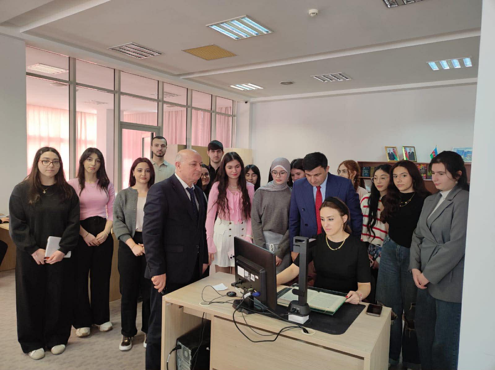 Kitabxananın rəqəmsallaşma, innovasiya və elektron xidmətlər üzrə direktor müavini, tarix üzrə fəlsəfə doktoru Oruc Quliyev və müvafiq şöbələrin əməkdaşları tərəfindən aparılan işlər tələbələrə əyani şəkildə nümayiş etdirilib. Tələbələr proseslə tanış olmaqla yanaşı, bəzi mərhələlərdə birbaşa iştirak da ediblər.